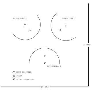 El día de la exposición, como espectador que entra a la instalación, veo que la sala es de unos diez metros de largo por diez de ancho y de unos ocho de altura. Me dirijo al centro del espacio cuyo piso está sin ocupar. Desde este punto, imaginando que fuera el centro de un círculo, veo tres estructuras similares dispuestas en lo que sería el perímetro de la circunferencia (figuras 1 y 2). Cada estructura está a una distancia aproximada de dos metros del punto central. Ellas se encuentran distribuidas equidistantemente entre sí, rodeándome, y noto que en cada una está una mujer. Vistas desde arriba, cada estructura se ve como un semicírculo definido solo por el borde, es de unos tres metros de alto y unos cinco de ancho, y pende del techo, de tal forma que queda a un metro del piso. Sobre mí cuelgan luces amarillas, incandescentes y tenues, que iluminan el espacio. Desde donde estoy puedo ver la parte externa de los semicírculos que están conformados por papeles burocráticos unidos entre sí, formando muros (figura 3)5.