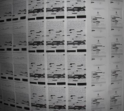 Al acercarme, al ver la primera estructura desde la parte externa de su semicírculo, percibo que los muros de papel están constituidos por hileras de papel colgantes. Por cada una de estas hileras, en la parte superior de la estructura, hay un papel; debajo de este está pegado, con ganchos metálicos, otro papel y este, a su vez, está unido a otro papel y así sucesivamente, hasta completar siete u ocho. Al lado de esta hilera, también unida con ganchos, se encuentra otra y así sucesivamente hasta formar un muro. Los papeles son impresiones en blanco y negro relacionadas con el desaparecimiento forzado de personas. Estos documentos tienen huecos que eliminan datos personales como nombres, números de documentos y direcciones. Por la similitud de los documentos noto que son formatos -emitidos por juzgados, la Fiscalía y otras instituciones- que funcionarios llenan con nombres y hechos.