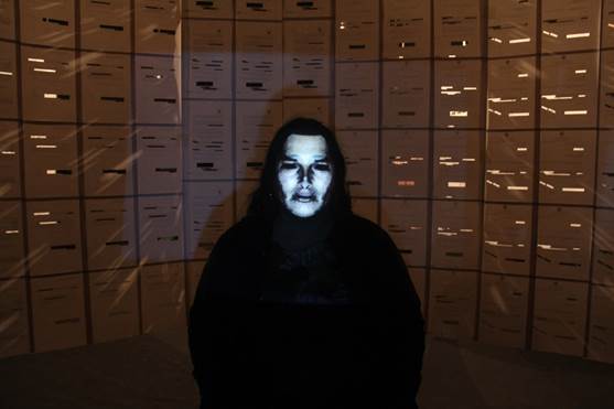 Me acerco a la parte interior de la tercera estructura. Allí se encuentra una mujer sentada con otra máscara proyectada sobre su rostro. Estos son apartes de su testimonio: