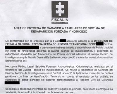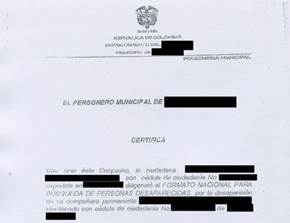 Interrumpo estos pensamientos para conversar con la mujer desde el exterior. Me dice que su nombre es Kely Vaneza Mendoza Vargas, hija de Jenny Vargas, a quien buscó sin éxito por muchos años. En la Fiscalía, hace varios años, le tomaron pruebas de ADN que sirvieron para que en 2018 identificaran restos del cuerpo de su madre en una fosa común. Esta entidad le entregó los restos humanos de su madre y un formato, un “Acta de entrega de cadáver a familiares de víctima de desaparición forzada y homicidio” (figura 7). Después de enterrar los restos se presentó en una Personería con el acta y meses después fue aceptada como víctima del conflicto.