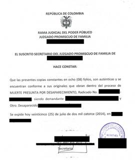 En el proceso de preparación de la obra con las protagonistas consideré que, así como el documentalista organiza y crea imágenes para documentar, las protagonistas de RN organizan, en un acto ritual, documentos (fotografías, textos, papeles burocráticos, etc.) y crean testimonios (que se convierten en documento) para probar la desaparición de su ser querido. Inclusive, emplean papeles burocráticos que cuestionan la desaparición, como el que dice “Muerte presunta por desaparecimiento” (figura 6), para probar que en este se falta a la verdad, porque no fue presunta, sino real. Por eso, veo sus montajes como documentales creados y enunciados por los mismos cuerpos de las protagonistas, lo que hace a esos cuerpos documento/documental. Al igual que en varios performances artísticos que se sostienen por el cuerpo, el cuerpo de los familiares de desaparición forzada es vital para su montaje.