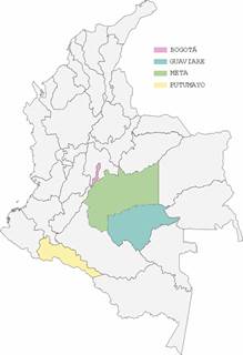 Al trabajar con las protagonistas hice una revisión para contextualizarme con la situación en la que acontecieron las desapariciones y me permito, brevemente, compartirla a lo largo del texto. El departamento del Guaviare, cuya capital es San José del Guaviare, está ubicado en el suroriente de Colombia (figura 8). Según el Instituto Amazónico de Investigaciones Científicas (Sinchi) (1999), el departamento incrementó su población antes de los años cincuenta del siglo XX, por la extracción de pieles y caucho, y desde la década de 1970 hasta 1999, por el cultivo de marihuana y coca.
