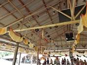 Nesse bojo, outro detalhe importante nessa performance ritual, em que corporeidades são fabricadas, diz respeito aos modos como a territorialidade Tembé é dinamizada dentro dos espaços na aldeia em que se executa a festa - no caso, a Ramada - a partir das interações e movimentações entre pessoas e espíritos, cujas agências se vinculam à terra (território) e atravessam aqueles corpos em transformação/amadurecimento. Aqui, o teto da Ramada Tembé (figura 1) é ornamentado com saias de piaçava, tipitis, peneiras, cuias, maracás e outros artefatos que ajudam a reter agentividades, fazendo assim um “elo” metonímico entre esse espaço sagrado e as dimensões sociocósmicas do próprio território Tembé, as quais serão igualmente projetadas nos corpos em produção durante a festa-ritual.