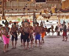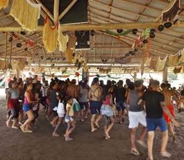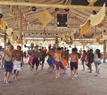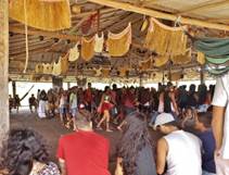 Por isso, na parte final da festa, no último dia do Moqueado, é realizada a performance do Rabo de Arraia (figura 6). Nesse momento, homens e mulheres dão os braços e formam uma corrente, dançando com muito vigor no “caminho das karuwaras”, em movimentos conjuntos de vaivém. Além de demonstrar força e unidade, o Rabo de Arraia serve para os Tembé afastarem os espíritos e fazê-los retornar às suas moradas, anunciando assim o encerramento da festa.
