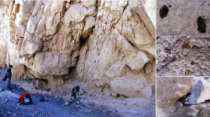 Estos colores pueden obedecer a la distinta antigüedad -se estima que muchos de estos acusis fueron lanzados a la piedra hace varias décadas- o a la yista que los acompañaba durante el coqueo4. Los huacheños afirman que es preciso coquear mucho tiempo para lograr un acho de esas características, con una humedad y textura pastosa tal que permita su adherencia a las rocas donde eran lanzados. Tales características podían, y aún pueden, ser alcanzadas por los troperos y burreros que transitan con sus animales durante largo tiempo sin poder o sin querer renovar su coca. Además, afirman que la gente de antes arrojaban sus acusis por lo peligroso que es el cerro ahí, “que parece que se cae”5. Según lo que aprendimos en nuestras conversaciones, la práctica parece no haberse modificado demasiado hasta el presente: si bien han sido muy pocos, hemos llegado a ver acusis frescos adheridos a la pared del cerro (figura 1).