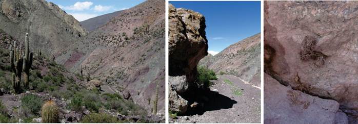 El segundo lugar de emplazamiento de los acusis se encuentra unos kilómetros más arriba, en la llamada Piedra de Acho o Piedra de Challa, una gran roca aislada a la vera del camino (figura 2), en un tramo ya prepuneño3. En ambos casos, entre las cuevas y en la Piedra de Challa, los acusis tienen el aspecto de una pasta homogénea, bien adherida a la roca, donde no es fácil identificar fragmentos de las hojas originalmente coqueadas. Del gran número de acullicos que se observan cercanos a las cuevas, muchos poseen distintas coloraciones que han obtenido luego de desecarse, oscilando entre un color gris piedra, verde oscuro y amarillento.