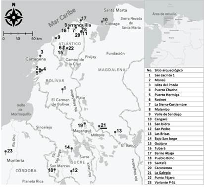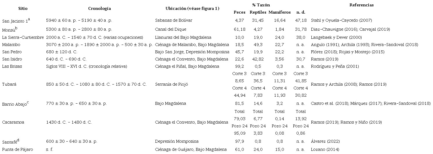 Los restos óseos de peces han sido reportados en veintitrés sitios arqueológicos de la Región Caribe de Colombia (véase tabla 7; Gutiérrez-Ferro 2022; Ramos s. f.; Ramos y Gutiérrez-Ferro s. f.). Estas ocupaciones cubren un margen de tiempo muy amplio que abarca desde el periodo Arcaico, entre 6000 y 5000 años a. p. en el caso de San Jacinto 1 (Stahl y Oyuela-Caycedo 2007) hasta el siglo XVI d. C. (± 450 años a. p.) al final de las ocupaciones de sitios como Barrio Abajo (Rivera-Sandoval 2018) y Tubará (Ramos y Archila 2008). No obstante, el nivel de resolución taxonómica varía considerablemente entre estos sitios y solo en doce casos se han realizado cuantificaciones que permitan conocer la distribución de los taxones dentro de los conjuntos de fauna (véase tabla 7; Ramos s. f.; Ramos y Gutiérrez-Ferro s. f.).