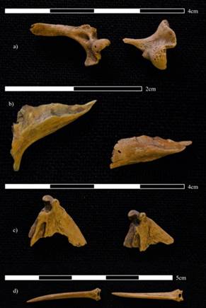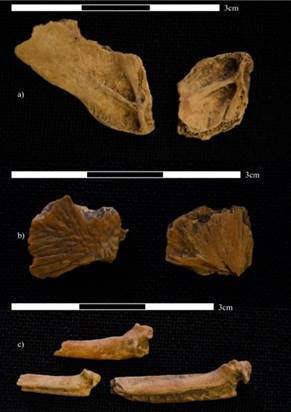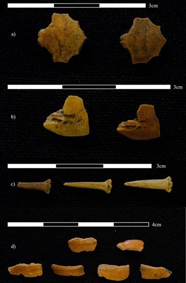 Por último, vale la pena mencionar que una porción pequeña de la muestra (compuesta por cerca de 200 restos, relativamente completos y bien preservados) fue identificada a nivel anatómico, asociando dichos restos con los siguientes elementos: cuadrado, dentario y premaxilar. No obstante, a nivel taxonómico, no mostraron correspondencia con ninguno de los especímenes de la colección de referencia consultada en la Universidad de los Andes. Por consiguiente, solo pudieron ser identificados a nivel de clase.