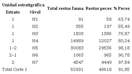 Durante la primera etapa de la investigación se determinó la distribución de los restos óseos de peces sobre el total del material zooarqueológico presente en la secuencia estratigráfica de La Galepia. Como se mencionó anteriormente, en el corte 1 de este sitio se excavaron ocho niveles artificiales, siete de los cuales contenían material cultural. Los ocho niveles se excavaron sobre dos estratos naturales. Por consiguiente, se determinó que cada nivel fuera excavado en capas de aproximadamente 3 cm, hasta completar una profundidad de 10 cm, con el fin de identificar y registrar los cambios de estrato y las concentraciones de materiales arqueológicos con precisión (Jaramillo y Ramos 2021). La tabla 1 presenta la distribución de los restos de peces sobre el total de restos óseos de fauna en esta secuencia de ocupación (para un perfil del corte 1 del sitio, véase Jaramillo y Ramos 2021).