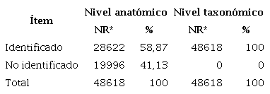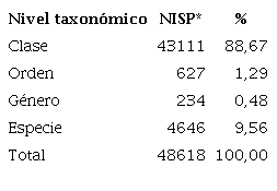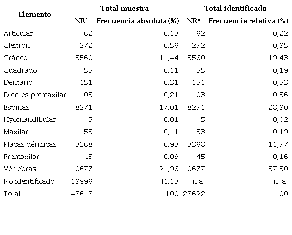 Se debe tener presente que el nivel de resolución taxonómica de la muestra es variable. El 88,7 % del total de restos de peces solo pudo ser identificado a nivel de clase (Osteichthyes: peces óseos) pues se trata de restos altamente fragmentados, cuyos rasgos diagnósticos no pudieron ser distinguidos con mayor especificidad. Dentro de esta parte de la muestra también se encuentra un gran número de vértebras y espinas, las cuales, pese a estar en su mayoría completas y ser fácilmente identificadas a nivel anatómico, presentan pocas características que permitan asignarlas a categorías taxonómicas más precisas. El resto de la muestra se distribuye de la siguiente manera: 9,6 % fue identificado a nivel de especie, 1,29 % a nivel de orden y 0,48 % a nivel de género (tabla 3).