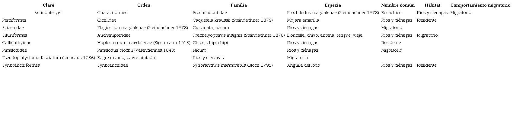 Con base en lo anterior, se determinó que la muestra ictioarqueológica de La Galepia está representada por distintas especies de peces óseos, las cuales pertenecen a los siguientes ordenes: Siluriformes, Perciformes, Characiformes y Synbranchiformes. Todas las especies identificadas son locales y habitan los cuerpos de agua dulce de la Depresión Momposina y la cuenca baja del río Magdalena. Cinco de estas especies tienen hábitos migratorios relacionados con sus ciclos reproductivos. No obstante, también se identificaron tres especies residentes, las cuales cuentan con adaptaciones que les permiten permanecer en la región durante las estaciones secas (tabla 4).