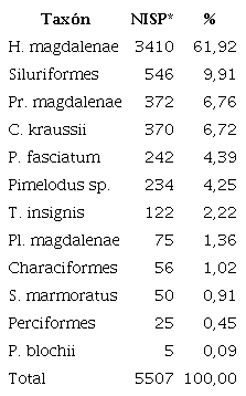 De acuerdo con el número de especímenes identificados por taxón (NISP) la especie más frecuente en la muestra es Hoplosternum magdalenae (chipe) (tabla 5). Esto puede deberse a que cada ejemplar de esta especie posee un gran número de placas dérmicas que recubren su organismo, lo cual puede producir una sobrerrepresentación del taxón en las muestras arqueológicas -tendencia reportada por Ramos y Niño (2019). En el contexto de esta investigación, la mayor parte del material identificado para esta especie corresponde a dichas placas dérmicas (figura 2).