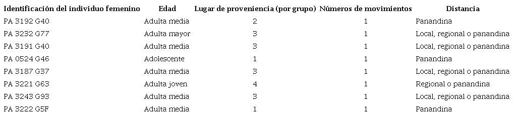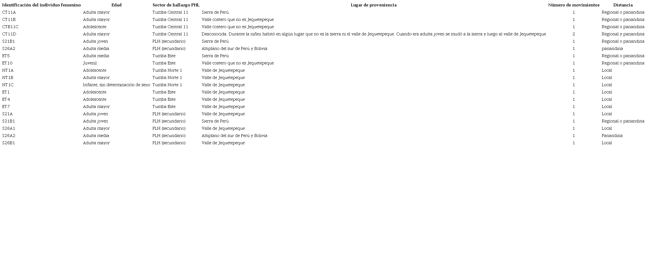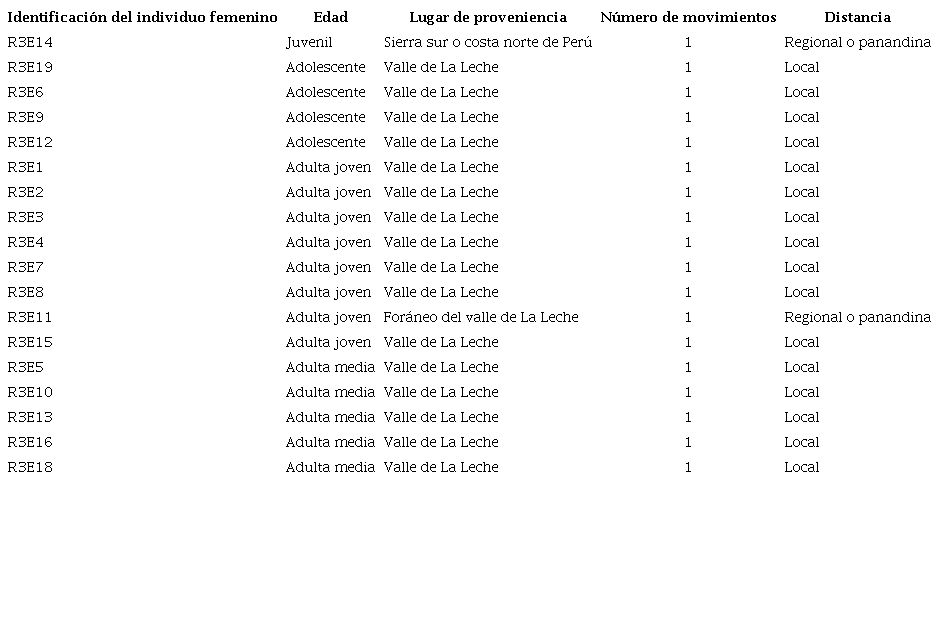 En el caso de Túcume, se analizó un total de 18 individuos de sexo femenino hallados en el cementerio del Templo de la Piedra Sagrada del sector Huaca Larga (tabla 2). La distancia recorrida a pie registra una frecuencia relativa porcentual de 88.9 % (n = 16) para el tipo local y de 11.1 % (n = 2) para el tipo regional o panandino. En cuanto a la edad de estas mujeres, se puede observar 12 adultas y 4 adolescentes asociadas a una movilidad de distancia local, y para la distancia regional o panandina tenemos un individuo juvenil y una adulta. Con respecto al número de movimientos, en todas las mujeres se registró un solo desplazamiento.
