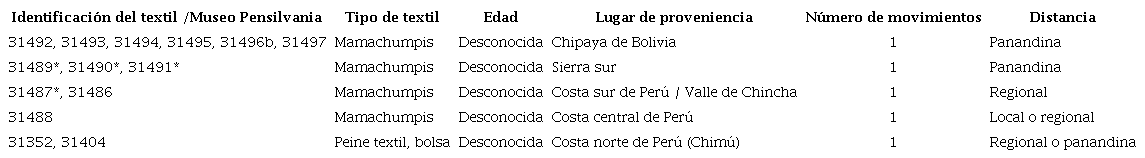 En cuanto al caso de Pachacamac, se consideró la información proveniente del material textil -principalmente mamachumpis- recuperado en un cementerio próximo al Templo de las Mamaconas (tabla 4). La información disponible para este caso no permite conocer la edad de las mujeres que se estuvieron moviendo, pero sí podemos observar que un 40 % (n = 2) habría recorrido una distancia panandina mientras las tres restantes -y en la misma proporción de 20 % (n = 1)- una distancia local o regional, regional y regional o panandina. En todos los casos fueron movimientos unidireccionales.