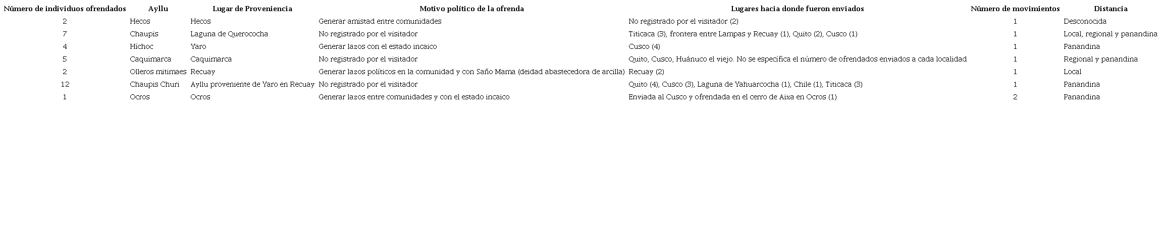 En el caso de las capacochas provenientes de Recuay y Ocros (tabla 5), si bien el lugar de procedencia de los 33 individuos -niñas/niños y juveniles- corresponde a diversos ayllus de la región de Recuay, las capacochas tuvieron diversos destinos a lo largo del Tahuantinsuyo. La distancia recorrida a pie indica que el 51.5 % (n = 17) lo hicieron a escala panandina; un 21.2 % (n = 7) a nivel local, regional y panandina; un 15.2 % (n = 5) a nivel regional y panandina; y un 6.1 % (n = 2) de manera local. El 6.1 % restante (n = 2) se desconoce. Para este caso fue interesante destacar la variable correspondiente al o a los motivos políticos por los cuales se realizó la ofrenda. En este sentido, se pudo destacar la prevalencia de la necesidad de generar lazos políticos entre las comunidades y el estado incaico. Por otra parte, en un individuo femenino proveniente de Ocros se registró un movimiento bidireccional. Se trata de Tanta Carhua de 10 años quien, junto a su padre Caque Poma y comitiva, caminó de Ocros hacia el Cusco y regresó nuevamente a su tierra para ser ofrendada como capacocha en el cerro de Aixa. En los otros eventos de capacochas no se indica si hubo desplazamiento hacia el Cusco, pero sí el lugar de origen y hacia donde fueron ofrendados.