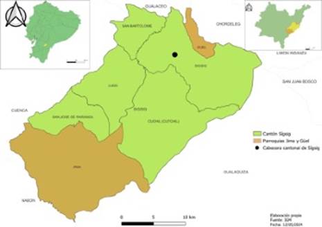 El Sígsig es un cantón (unidad administrativa política-territorial) predominantemente rural (figura 1). En este espacio de la región austral se construyen una diversidad de paisajes donde sobresalen elementos naturales como montañas, ríos y lagunas que, además, se relacionan y vinculan con la identidad cultural local cañari (cultura aborigen). Entre estos lugares tenemos elevaciones como Fasayñán, Chirir, Culebrillas, Moriré, Picacho y lagunas como Ayllón, Amorgeo, entre otras. De esta manera, Sígsig se constituye como una jurisdicción particularmente especial, dada la presencia de varias áreas arqueológicas -y por ende una riqueza material-, que sustentan una trayectoria histórica compleja, con relatos que hablan, por ejemplo, de la presencia de tumbas con profusas cantidades de oro (Saville y Segarra 2000; Uhle 1922), y por otros hallazgos que conforman un corpus de imaginarios socioculturales concentrados en sitios arqueológicos como la Cueva Negra de Chobshi, el Castillo de Duma, Shabalula y la laguna de Ayllón.