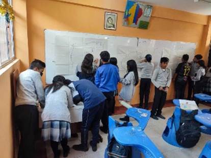 Para este estudio se trabajó mediante croquis graficados de modo libre o también conocidos como mapas mentales, que son herramientas útiles y sencillas de aplicar con aquellos grupos que tienen una primera aproximación a dicha temática, en este caso, al patrimonio arqueológico. La actividad se desarrolló con talleres en áreas comunales (figura 5). En primera instancia se utilizó un papelote (papelógrafo), que distinguió los límites de un territorio, ya sea de todo el cantón como de sus parroquias. Este mapa base coadyuvó para que los participantes conectaran sus experiencias, percepciones y usos que tienen y le dan al patrimonio, en especial el arqueológico. En esta indagación, la CP se aplicó a estudiantes de colegio, profesores y otros actores locales, así como presidentes de juntas parroquiales y líderes de organizaciones comunitarias. Las edades estaban entre los catorce y los setenta años, con la finalidad de recuperar y comparar una variedad de criterios.