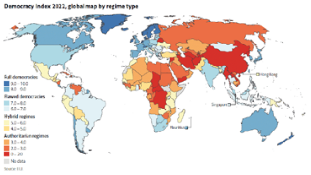 Índice de Democracia 2022, mapa mundial por tipo de régimen (Democracy Index 2022 | Economist Intelligence Unit, 2023, p.5.)