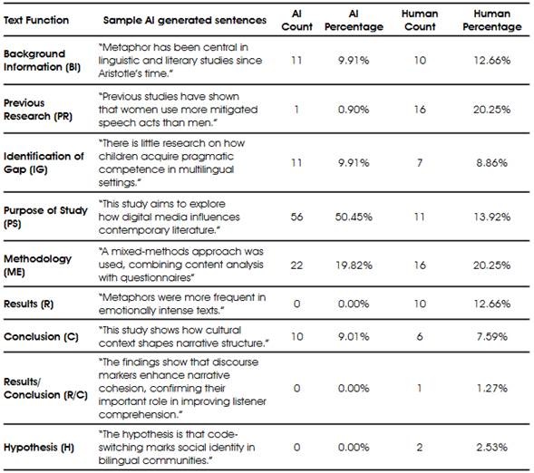 Therefore, the analysis of text function recurrence in AI-generated and human-written abstracts demonstrates that both types share common structural elements while also exhibiting distinct features. Identifying these differences using genre analysis is feasible, as the generic structure of academic abstracts is predictable. The recurrence patterns provide insights into how each type of abstract prioritizes different aspects of research presentation, reflecting both shared conventions and unique characteristics of their respective creation processes. While AI-generated and human-written abstracts adhere to similar genre conventions, they differ in their emphasis and distribution of text functions. These differences can be systematically identified and analyzed, contributing to our understanding of how abstracts are constructed and the potential impact of AI in academic writing.