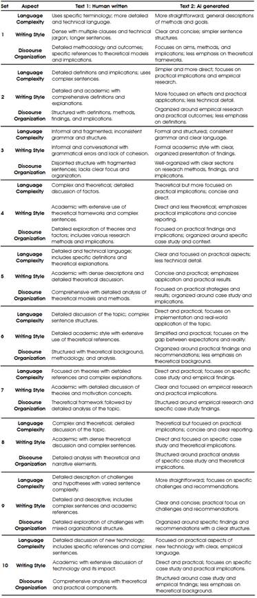 As to AI-generated texts, they focused on aims, methods, and practical outcomes with less emphasis on theoretical frameworks. The organization tended to be more streamlined, centering on empirical research and practical implications. While this approach facilitates a straightforward presentation of findings and recommendations, it may lack the detailed theoretical context and comprehensive analysis found in human-written texts. The AI’s organization is often designed to ensure clarity and coherence, which can enhance the accessibility of the content.