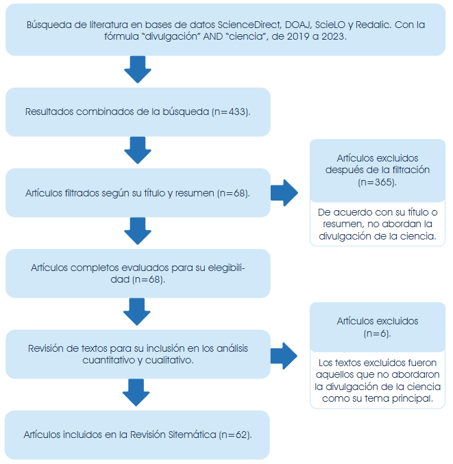 2. Aplicación de criterios de inclusión y exclusión. Aunque los resultados mostraron más de un tipo de documento, sólo se tomaron en cuenta artículos de investigación. Para confirmar lo anterior, se revisó que cada publicación aceptada tuviera sección de introducción, método, resultados y discusión. Otro de los criterios aplicados para aceptar artículos científicos fue el año de publicación. Solo se aceptaron artículos de investigación publicados entre 2019 y 2023. Se obtuvieron trabajos en español y portugués, aunque para ninguna de las cuatro bases de datos se limitó la búsqueda a algún idioma en particular. En suma, de las bases de datos investigadas, la búsqueda arrojó un total de 433 documentos (58 en ScienceDirect, 9 en DOAJ, 66 en SciELO y 300 en Redalyc). El paso siguiente fue valorar la pertinencia de cada artículo mediante la lectura de su título, resumen y palabras clave; solo 68 documentos fueron considerados para el análisis. Más adelante, se revisaron completamente los documentos y se encontró que algunos de ellos no abordaban el término divulgación científica como un proceso de comunicación de especialistas para no especialistas. Por lo anterior, se excluyeron seis artículos y el análisis final de esta revisión sistemática se hizo con 62 textos, como se observa en la Figura 1.