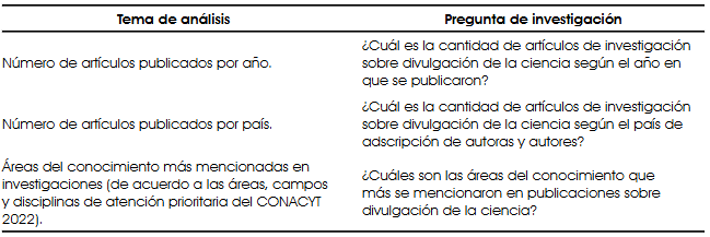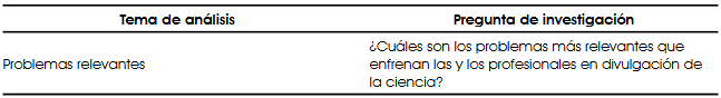 Por otro lado, en la Tabla 2 se presenta la pregunta de investigación que encabeza el análisis cualitativo, con el objetivo de identificar aquellos retos que representan mayor importancia para los especialistas en divulgación de la ciencia.
