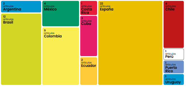 Por otro lado, en el tema de la cantidad de textos científicos publicados por país, España es el que, con 22 artículos, tuvo más publicaciones. El siguiente fue Brasil, con 12 artículos sobre divulgación de la ciencia, como se observa en la Figura 3. Es importante recalcar que, en el análisis de resultados por nación se consideró el país de adscripción de autoras y autores, independientemente de la ubicación geográfica del fenómeno estudiado o de la revista científica que publicó.