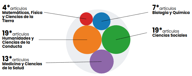 Por otro lado, el total de artículos revisados en esta investigación fue ordenado de acuerdo con las áreas, campos y disciplinas de atención prioritaria del CONACYT (2022), para ordenar las investigaciones sobre divulgación de la ciencia. Con base a lo anterior, son dos las categorías del conocimiento que más artículos contienen: Ciencias Sociales, con 19 trabajos científicos sobre producción de radio, televisión, cine y otros medios digitales, y su impacto en la sociedad. De igual forma, Humanidades y Ciencias de la Conducta también tuvieron 19 publicaciones, que van desde los estudios experimentales, hasta los proyectos de conservación del patrimonio histórico e impulso al cuidado del medio ambiente, pasando por obras de teatro para la reflexión y la enseñanza mediada por tecnología.