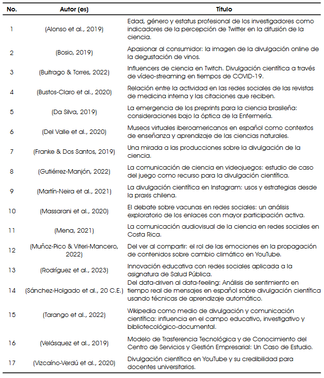 Uno de los trabajos científicos más significativos de esta revisión es el publicado por Vázquez (2019), en el que se aborda uno de los medios más empleados para la divulgación de la ciencia y tecnología: la radio. Con el respaldo de las instituciones educativas y el aprovechamiento de recursos provenientes de las TIC, las estaciones universitarias han construido diversas redes de colaboración con las cuales ha sido posible compartir el conocimiento a diferentes grupos sociales sin importar el país o incluso el idioma; respondiendo así, al compromiso social que la divulgación científica considera entre sus principios fundamentales. De la misma forma, el artículo de Martín-Pena et al. (2020) describe cómo es que la radio como medio de divulgación científica es aprovechado a favor del impulso de vocaciones científicas en estudiantes de educación básica.