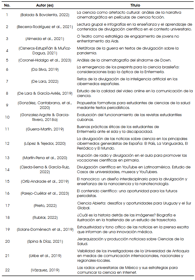 De igual forma, sobre medios de comunicación y su aprovechamiento en la divulgación de la ciencia, la descripción sobre cómo se gestionan y dispersan las noticias relacionadas a la salud, resulta útil para el análisis del impacto social, de acuerdo con el trabajo científico de Spina & Díaz (2021). Por otra parte, se encontró que la información en medios periodísticos de contenido científico-médico también puede aprovecharse en procesos de enseñanza-aprendizaje de médicos en formación, de acuerdo con González, Cantabria et al. (2020). Y por último, el contenido multimedia no es el predominante en la divulgación científica que emplea el internet como medio, el texto es el recurso más utilizado, de acuerdo con el artículo publicado por López & Tejedor (2020).