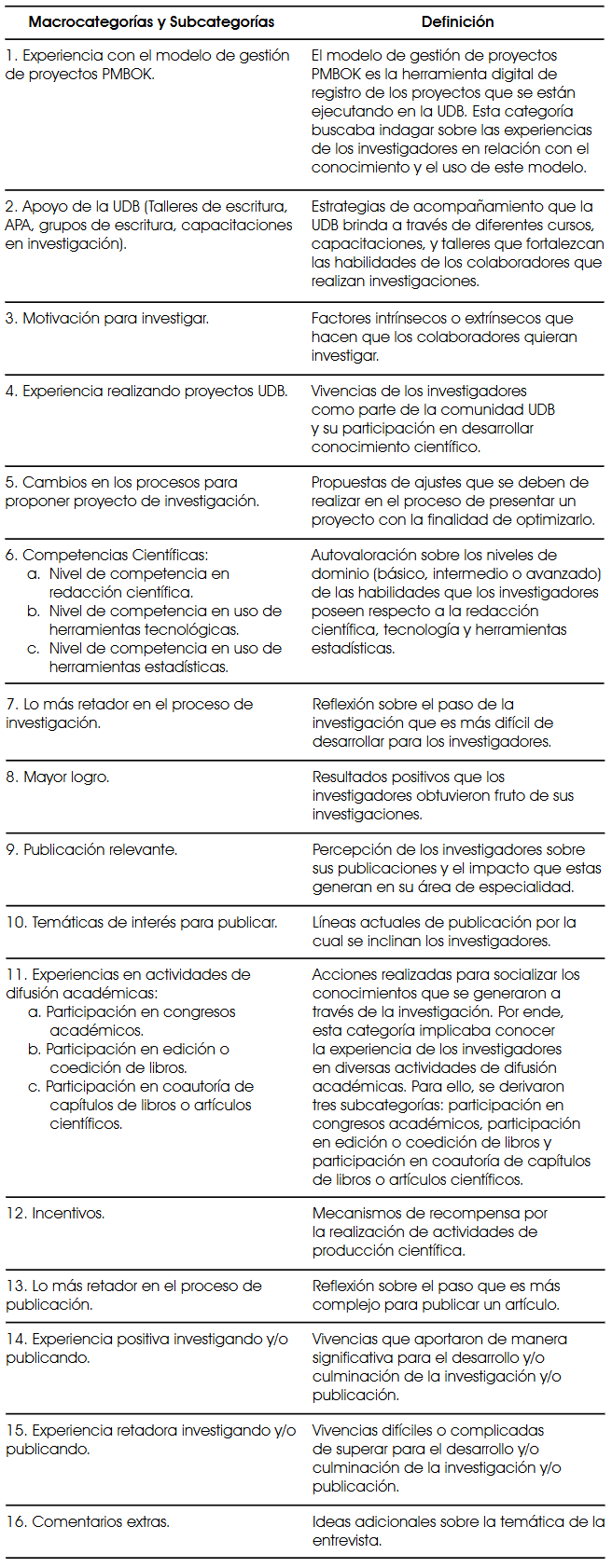 De manera similar, la información obtenida de los miembros del consejo se analizó mediante 12 categorías iniciales que se redujeron a 7. La Tabla 2 presenta las macro y subcategorías con sus correspondientes definiciones.
