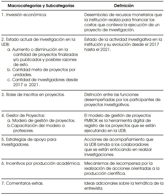 Con el fin de solicitar a los docentes su colaboración con el presente estudio, se aplicó como criterio de selección haber registrado de tres a cinco proyectos de investigación en el período de 2017 a 2021. Así, de un total de 152 investigadores, se seleccionaron 10 que cumplían con el criterio propuesto. De estos, nueve fueron entrevistados. Adicionalmente, se solicitó la colaboración de dos miembros del Consejo de Investigación de la UDB con el fin de obtener datos complementarios sobre la actividad investigativa en la universidad.