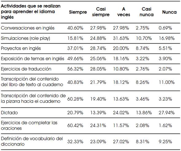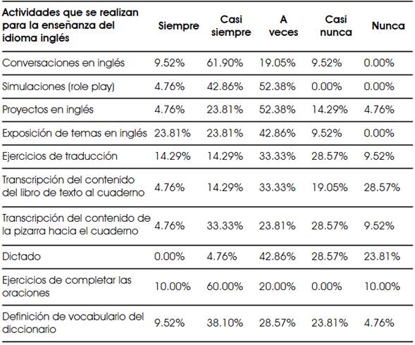 Sin embargo, los ejercicios de traducción (56.32%), la transcripción del libro al cuaderno (40.83%), la transcripción del texto de la pizarra al cuaderno (60.28%), los ejercicios de completar las oraciones (60.42%) y las definiciones de vocabulario con el diccionario (32.33%) se realizan en mayor frecuencia en los procesos de enseñanza. Estos datos, en cierta medida contradicen el énfasis proporcionado por los docentes, ya que ellos manifestaron emplear actividades comunicativas (conversaciones 61.90%, simulaciones 52.38%, proyectos en inglés 52.38% y exposiciones de temas en inglés 42.86%); sin embargo, los estudiantes exponen una realidad distinta, en la cual se implican en actividades más tradicionales que no fomentan la comunicación del idioma.