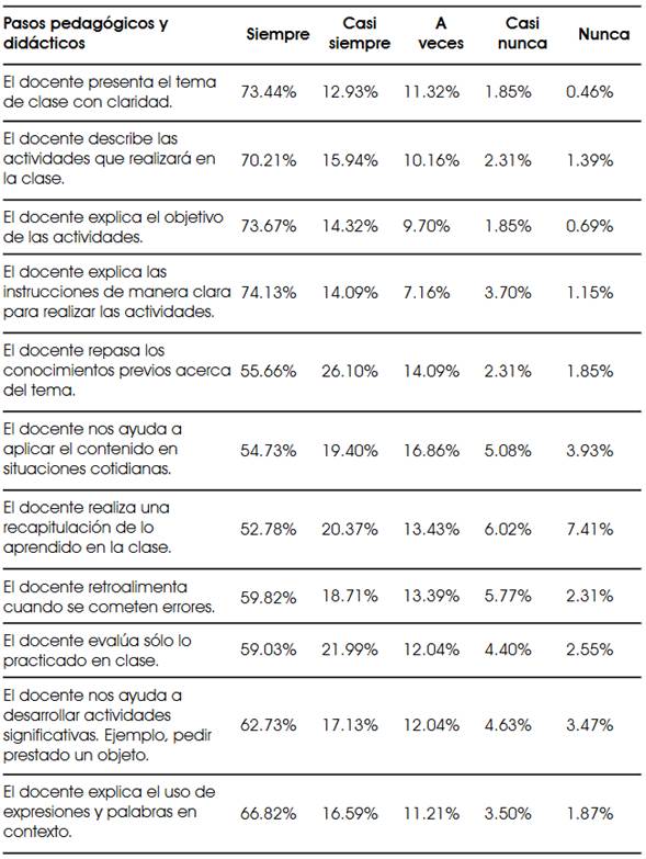 En el proceso de enseñanza y aprendizaje, tanto estudiantes como docentes deben estar conscientes de que están aprendiendo. No obstante, los docentes son los responsables de impartir la clase, así como de dar instrucciones claras, evaluar adecuadamente, proporcionar retroalimentación y correcciones oportunas que contribuyan al logro de objetivos académicos. A continuación, se presenta la frecuencia con la cual, según las respuestas de los estudiantes en el cuestionario, los docentes aplican los pasos pedagógicos y didácticos en sus clases.