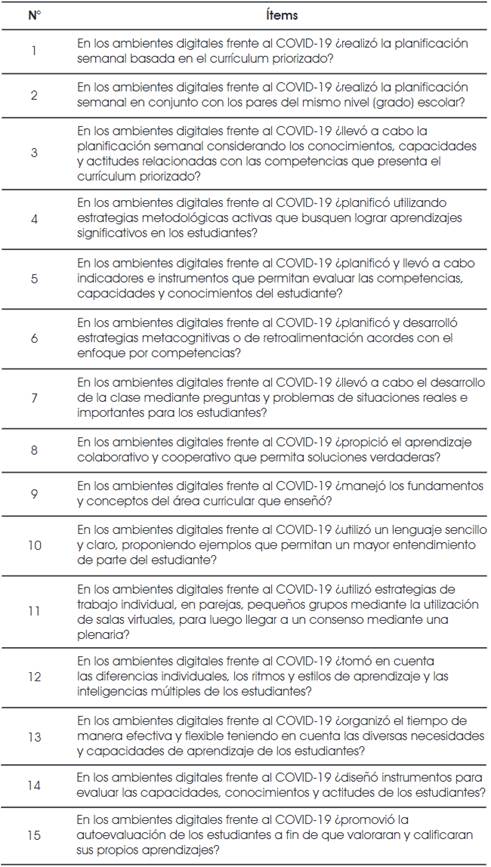 Para la validación del cuestionario, los investigadores se apoyaron en dos expertos en pedagogía y un especialista en bioestadística, métodos de investigación y evaluación educativa; para el análisis de los ítems, en primera instancia se elaboraron 30; al evaluar la calidad de esos ítems y el cuestionario como un todo, se eliminaron aquellos que presentaban ambigüedad. A partir de la discriminación inicial se realizaron los ajustes correspondientes estimando su consistencia interna, resultando en 15 ítems definitivos que se aplicaron a la muestra seleccionada (Tabla 1).