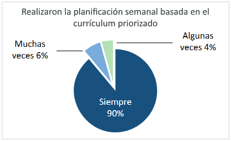 En la pregunta 1 se quería saber si los docentes realizaron la planificación semanal basada en el currículum priorizado, que es uno de los aspectos relacionados con la planificación semanal, establecido en la Estrategia Nacional de Educación 2020/2021 del Meduca. Los resultados mostraron que el 90% de los docentes la realizó ‘siempre’, el 6% lo aplicó ‘muchas veces’ y el 4% ‘algunas veces’, lo que se corresponde con las características del liderazgo educativo en tiempos de crisis (Striepe y Cunningham, 2020), y el cumplimiento de sus funciones, sin embargo, cuando se buscó identificar si también realizaron la planificación de acuerdo con su segmento con sus pares (pregunta 2), el resultado de quienes lo realizaron siempre fue de un 16%. En la Figura 1 se exponen los resultados de la pregunta 1.