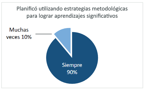 Con respecto a la aplicación de los conocimientos, capacidades y actitudes relacionadas con las competencias que presenta el currículum priorizado, al momento de planificar, el 16% afirmó que lo realizó ‘muchas veces’ y el 84% ‘siempre’. Barrot, Llenares y Del Rosario (2021), ya mencionaban que uno de los principales retos en la pandemia mientras se experimentaba con las clases virtuales, fue alcanzar el aprendizaje significativo, por lo que, de acuerdo con la respuesta a la pregunta 4 para determinar si los docentes planificaron utilizando estrategias metodológicas activas para lograr aprendizajes significativos en los estudiantes (Figura 2), el 90% de los docentes indicó que ‘siempre’ utilizaron estrategias metodológicas activas para lograr esta meta y el 10% restante respondió ‘muchas veces’.