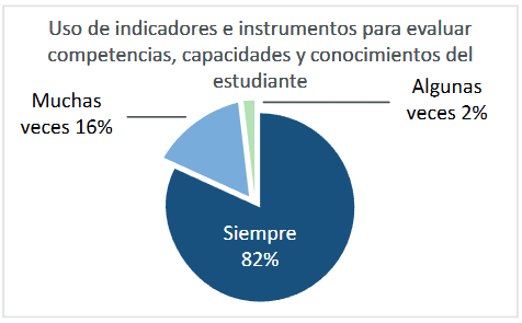 Cuando se preguntó acerca de organizar el tiempo de manera efectiva y flexible teniendo en cuenta las diversas necesidades y capacidades de aprendizaje de los estudiantes (pregunta 13), el 86% de los docentes señaló hacerlo ‘siempre’ y un 14% ‘muchas veces’. Sobre el diseño de los instrumentos para evaluar las capacidades, conocimientos y actitudes de los estudiantes (pregunta 14), el 80% de los docentes señaló realizarlo siempre, el 14% ‘muchas veces’ y el 6% ‘algunas veces’.