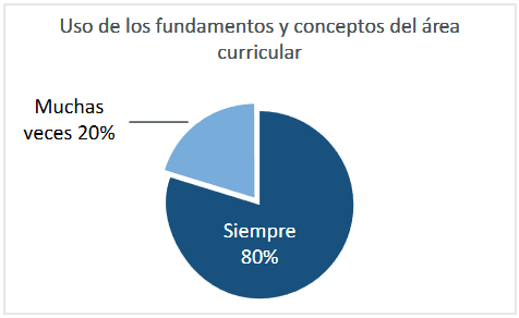 En la pregunta 7 el 70% de los docentes que ‘siempre’ realizan el desarrollo de las clases mediante la aplicación de preguntas y problemas de situaciones reales e importantes para los estudiantes, el 26% ‘muchas veces’ y el 2% ‘algunas veces’. En la pregunta 8, al preguntar si en los ambientes digitales frente al COVID-19 se propició el aprendizaje colaborativo y cooperativo que permitiera soluciones verdaderas, respondieron que ‘siempre’ lo hacían (60%), ‘muchas veces’ (38%) y ‘algunas veces’ (2%). Así mismo, en la pregunta 9, con relación al manejo de los fundamentos y conceptos del área curricular, el 80% aseguró manejarlos ‘siempre’, mientras que el 20% lo hizo ‘muchas veces’ (Figura 4).