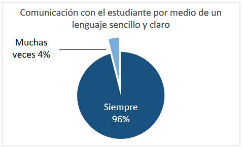 Al indagar sobre la pregunta 10 para saber si el docente utilizó un lenguaje sencillo y claro, proponiendo ejemplos que permitieran un mayor entendimiento de parte del estudiante (Figura 5), el 96% de los docentes lo utilizó ‘siempre’ y el 4% ‘muchas veces’.