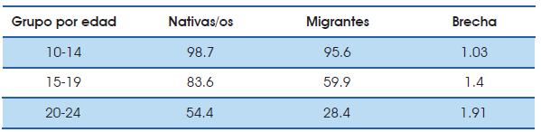 Binstock y Cerrutti (2014), precisan datos de las trayectorias de jóvenes migrantes en escuelas medias del Área Metropolitana de Buenos Aires (AMBA). En primer lugar, dan cuenta de la brecha que existe en la tasa de escolarización de nativos y de migrantes.