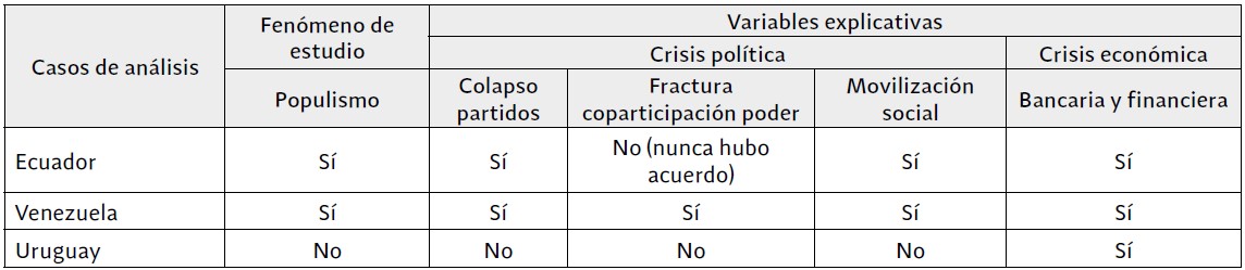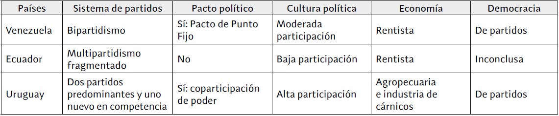 Ningún país ha estado exento de crisis políticas y económicas, y muchas veces las primeras han sido el correlato de las segundas; sin embargo, la manera de enfrentar esta situación por parte de Ecuador, Venezuela y Uruguay ha sido diferente en tiempo, intensidad y recursos. El papel que han tenido las instituciones ha sido clave. Entonces, si se parte de la conjetura de que el populismo deviene tras una crisis política, más que de una de carácter económico, es una prioridad caracterizar los países de estudio y su funcionamiento antes de la emergencia populista.