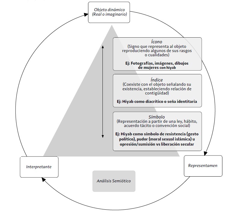 Si un ícono designa al signo que mantiene una relación de semejanza con el objeto representado, nos preguntamos, entonces, ¿qué sucede cuando ese ícono desplaza la relación de semejanza con el objeto hacia otros espacios y objetos por fuera de la representación clásica? En otras palabras, si el hiyab —para tomar un ejemplo— indica una relación directa con lo religioso, ¿cómo se entiende cuando la imagen traslada su correspondencia hacia lo político y lo étnico, dotando a lo religioso de otros sentidos en correspondencia con los procesos identitarios en contextos de transnacionalización?