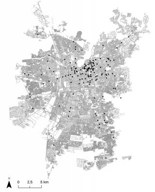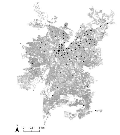 La información proveniente de las encuestas se analizó de manera cuantitativa, mientras que las entrevistas se interpretaron mediante una metodología de análisis cualitativo.7 En lo que respecta a la información sobre las características físicas y funcionales, se abordó mediante un mapeo de origen, residencia y destino, así como de la conectividad de la red de transporte público y peatonal del sector. El tipo de comercio se mapeó y se catalogó según categorías establecidas por Zukin, que se refieren a las escalas de la economía del consumo, es decir, la escala local de comercio de barrio, la escala de los nuevos emprendedores que traen nuevas prácticas de consumo a un barrio y la escala del consumo global (Zukin 2009).
