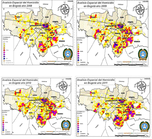 Lugares de Bogotá donde se registró el mayor número de homicidios en el segundo semestre del 2011 (51 hotspots,7 ubicados en las localidades8 de Suba, Ciudad Bolívar, Rafael Uribe, Kennedy, Los Mártires, Usaquén, San Cristóbal y Bosa). En su selección se analizaron todas las noticias criminales de homicidio registradas en el segundo semestre de 2011, extrayendo las direcciones o coordenadas para ponderarlas en orden descendente, seleccionando los puntos con mayor densidad en violencia homicida, los cuales fueron georreferenciados en un mapa de calor9 de Bogotá, y contrastando el comportamiento del delito durante los últimos cuatro años, para identificar consistencia criminal.