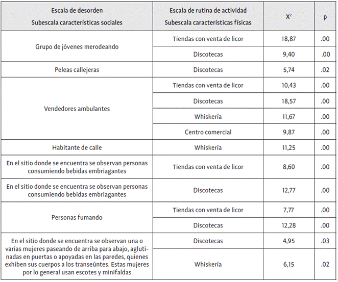 Se tomó la escala de desorden y se asoció con las características físicas y sociales de las otras escalas, buscando identificar las características ambientales con mayor relación en la comisión del delito de homicidio (sólo se tuvieron en cuenta las asociaciones que resultaron estadísticamente significativas). En las tablas 2 a 6 se presentan las subescalas de las características físicas de la escala de desorden, cuyas asociaciones resultaron estadísticamente significativas con las subescalas de características sociales y de territorialidad y rutina de actividad.