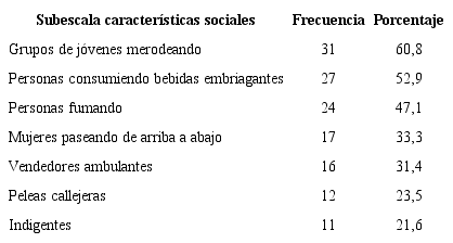 La distribución de frecuencias de los indicadores de la subescala características sociales en los sitios donde se aplicaron los cuestionarios reflejó que en el 60,8% de los sitios se encontraban grupos de jóvenes merodeando, en el 52,9% había presencia de personas consumiendo bebidas embriagantes y en el 47,1% se encontraban personas fumando (ver la tabla 1).