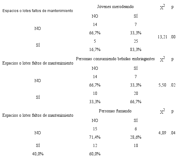 La primera asociación que se realizó fue entre la subescala características físicas y la subescala características sociales de la escala de desorden; la asociación evidenció significancia relevante del ítem “espacios o lotes faltos de mantenimiento” de las características físicas con tres ítems de características sociales: “grupo de jóvenes merodeando”, “en el sitio donde se encuentra se observan personas consumiendo bebidas embriagantes” y “personas fumando”, que, de acuerdo con la teoría, son características que llevan a los residentes de la zona a percibir problemas en el sector, perder confianza en su vecindario y dificultar la habilidad de la policía para prevenir y controlar la criminalidad (ver la tabla 2).