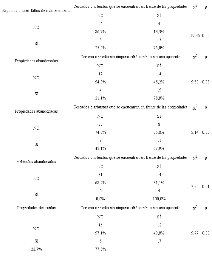 Entre las características físicas de la escala de desorden y la subescala características físicas de la escala de espacio defendible, sólo se encontró asociación estadísticamente significativa entre el ítem “espacios o lotes faltos de mantenimiento” de la escala de desorden y el ítem “árboles o arbustos que tapan las entradas de las propiedades e impiden la visibilidad de las mismas por parte de un observador externo” de la escala de espacio defendible. Por lo tanto, se observa que la falta de barreras simbólicas de la teoría del espacio defendible y las condiciones físicas facilitan la ejecución del delito de homicidio (el valor del Chi-cuadrado fue de 12,59, con una significancia p =.00).