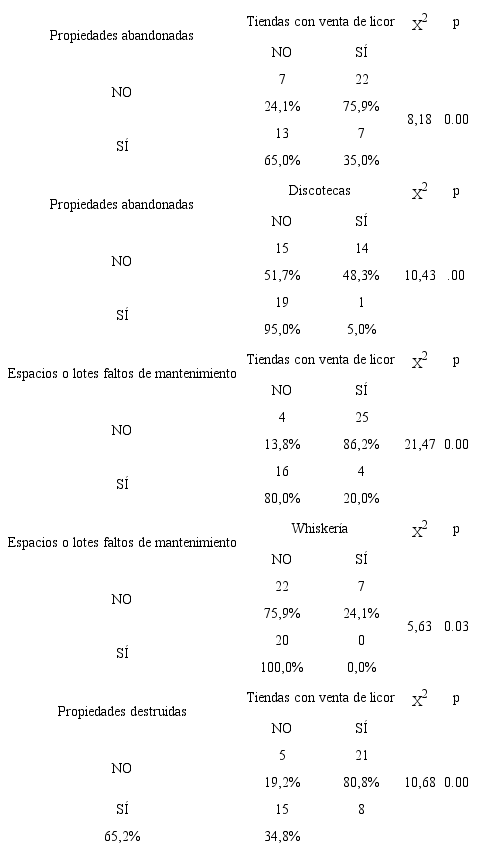Al asociar las características físicas de la escala de desorden con las características físicas de la escala de rutina de actividad se encontró relación significativa entre las características físicas de la escala de rutina de actividad que evidencian consumo de alcohol, tales como “tiendas con venta de licor”, “discotecas” y “whiskerías”,13 y “propiedades abandonadas” y “espacios o lotes faltos de mantenimiento”, ítems de las características físicas de la escala de desorden, identificando que las características físicas relacionadas con el consumo de licor y estructuras físicas, las cuales indican descuido en la zona, tienen mayor incidencia para la comisión del homicidio. No obstante, las dos condiciones no suelen estar presentes al mismo tiempo (ver la tabla 4).